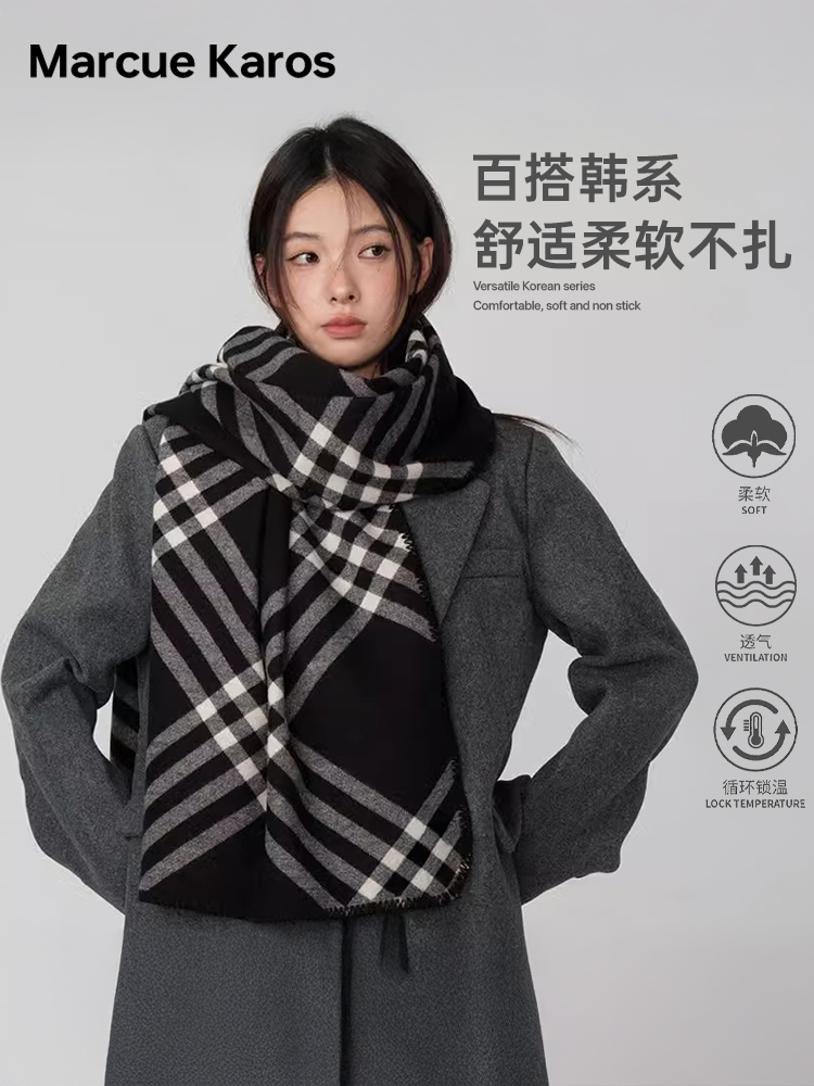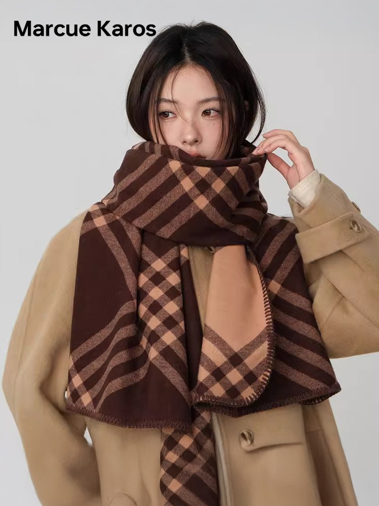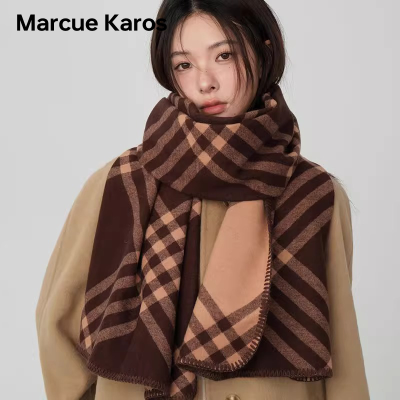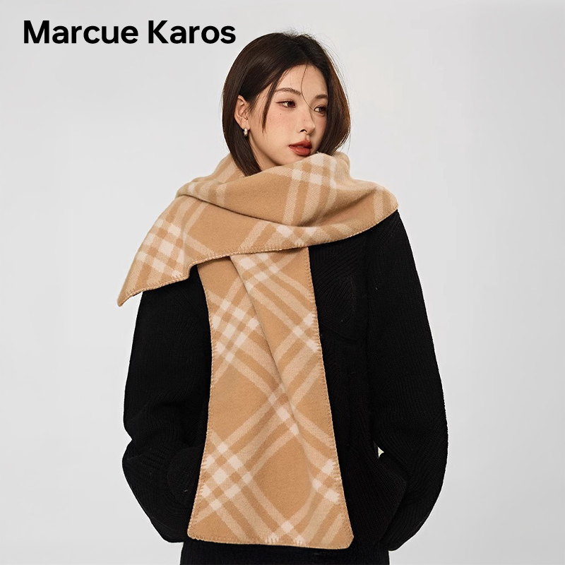 At the core of this scarf’s allure is its premium cashmere construction. Cashmere is renowned for its exceptional softness, lightweight warmth, and ability to feel gentle against the skin—no itchiness, just pure comfort. Unlike inferior alternatives, Marcue Karos’ cashmere is carefully sourced and crafted, ensuring durability and a plush feel that only improves with time. Whether you opt for the classic black – white check, warm camel plaid, or rich brown – beige pattern, the cashmere’s quality is evident in every thread.